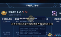 王者荣耀2025巅峰挑战赛额外战力有什么作用?众所周知王者荣耀这款游戏已经成为游戏玩家手机必备的游戏之一了,当然该游戏在参与排位赛后是会有等级的,游戏玩家在登上王者时是可以参加巅峰赛的,那么是不是还有很多游戏玩家不知道巅峰赛额外战力有什么作用的,接下来小编就为大家带来王者荣耀2025巅峰挑战赛额外战力有什么作用的详细介绍! 王者巅峰赛额外战力解释王者荣耀巅峰挑战赛额外战力是什么意思?很多小伙伴对于额外战力的意思不太清楚,那么小编就给大家介绍一下,下面小编给大家带来王者荣耀巅峰挑战赛额外战力作用介绍,还不清楚的小伙伴赶紧来看看吧。①首先额外战力,在作用上和荣耀战力一样,可计入【小国标/区级/市级/省级标】,但是【不会计入大国标】。也就是说国服最强的前十名战力排行,不会算上额外战力。②另外还有一点需要注意,就是额外