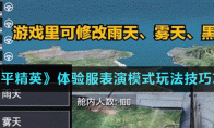 《和平精英》体验服表演模式怎么玩?最近和平精英体验服中推出了全新的表演模式,很多小伙伴表示不知道新模式怎么玩,那么接下来小编为大家带来《和平精英》体验服表演模式玩法技巧攻略,一起来看看吧。《和平精英》体验服表演模式玩法技巧攻略1、房卡——表演模式的作用和玩法。 使用该房卡后可以创建一次表演模式权限的房间,表演赛可以选择一人作为主持人。主持人进入游戏后会变成上帝视角,可以对随机特种兵投放空袭轰炸和沉重的爱意当作惩罚。2、当然了,有惩罚就会有奖励,主持人可以随机选择一名特种兵投放礼包物资,点击投放会有一台小无人机将物资送到该特种兵身边。3、除此以外,主持人还可以修改雨天、雾天、黑夜模式,以及随机刷新安全区的位置哦。可以看出,在这个模式中,玩家可以扮演上帝进行对游戏内容的操纵。既可以帮助玩家更容易对决,也可以从中作梗
