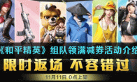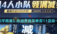 《和平精英》游戏中你消费我买单双11活动怎么玩?对于到来的双十一游戏中推出了你消费我买单活动,很多小伙伴可能不知道这个活动应该怎么玩,那么接下来小编为大家带来《和平精英》你消费我买单双11活动一览,一起来看看吧。《和平精英》你消费我买单双11活动一览活动时间 11月11日-11月13日。活动详情 活动期间连续3天每晚20:00、21:00、22:00准点开奖,11月11日 00:00 - 11月13日 22:00期间,消费任意点券且抽奖时间在线都有资格参与返还抽奖,最高可返还100%消费的点券。进队就领满减券 最高减500点券 活动时间 11月9日-11月15日。活动详情 活动期间在界面参与4人小队玩法,进队即可领取满减券,根据小队成员人数,可解锁更多奖励哦~小队成员达到4人即可获得全部奖励。为中国队加油 兑换