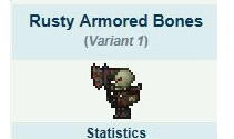 《泰拉瑞亚》手机版中的锈蚀装甲骷髅只会在板墙区域里刷新,这些武装过的骷髅拥有更快的移动速度以及更高的攻击力,所以我们不能近身搏斗。选择远程武器击杀是最好的办法。锈蚀装甲骷髅 ID:269~272类型:不死敌人AI:战士AI特征:只生成在板墙区域,其他同骷髅,敌对。与僵尸相似,但是速度很快,在非地下环境离开视线会消失,暴露在阳光下不会燃烧注意:地牢最常见的怪,几乎遍布每一个角落。建议用穿墙武器来对付它们,比如死神镰刀。或是使用杀伤性大的远程武器干掉它们 掉落 10银币粘性绷带巨战匙刃没啥用的武器,攻击不高,速度慢,又没法连击磁暴之球消耗魔法射出一个缓慢移动会自动攻击敌人的磁暴球骨羽毛:用来制作骸骨魔翼瓶中灵:召唤一个会发光的小♂精♂灵注意:同蓝色装甲骷髅其他:真正的老骨头,都生锈了