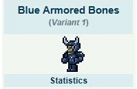 《泰拉瑞亚》手机版中的蓝色装甲骷髅是不死类的怪物,只会在普通砖墙区刷新。其实就是僵尸的一种,特点是速度很快,所以战斗时注意保持距离,最好在远程位输出。这样会比较安全。蓝色装甲骷髅 ID:277~280类型:不死敌人AI:战士AI特征:只生成在普通砖墙区域,其他同骷髅,敌对。与僵尸相似,但是速度很快,在非地下环境离开视线会消失,暴露在阳光下不会燃烧注意:地牢最常见的怪,几乎遍布每一个角落。建议用穿墙武器来对付它们,比如死神镰刀。或是使用杀伤性大的远程武器干掉它们 掉落 10银币盔甲光亮剂巨战匙刃没啥用的武器,攻击不高,速度慢,又没法连击磁暴之球消耗魔法射出一个缓慢移动会自动攻击敌人的磁暴球骨羽毛:用来制作骸骨魔翼瓶中灵:召唤一个会发光的小♂精♂灵