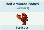 《泰拉瑞亚》手机版中的地狱装甲骷髅是一种刷新在瓦墙区的怪物,唯一一点和普通骷髅不同的是它的攻击会自带debuff。建议还是远程打比较安全。地狱装甲骷髅 ID:277~280类型:不死敌人AI:战士AI特征:只生成在瓦墙区,会发光,攻击有几率触发“燃烧”debuff,其他同骷髅注意:不难找,因为本身会发光。跟蓝色装甲骷髅一样棘手,血一样厚,而且这个攻击还带有debuff。虽然不是地牢主力军,但是也相当危险。其他:凋灵骷髅……? 掉落 10银币巨战匙刃磁暴之球骨羽毛、瓶中灵