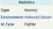 《泰拉瑞亚》手机版中的黑暗木乃伊比起一般的木乃伊增强了一些,不过基本上没什么区别。增加的这点伤害基本可以忽略不计了。就当做一般的木乃伊来打就好了。黑暗木乃伊 类型:木乃伊AI:战士AI特征:只在神圣化的沙漠生成,木乃伊是壹种肉山后的沙漠怪物。外观上,它有着灰色的轮廓。它以战士AI出现和移动。黑暗木乃伊有150%于其他木乃伊的移动速度。所有木乃伊都会增加100%的速度,如果它的血量低于50%。所有木乃伊都免疫减速,黑暗木乃伊免疫沉默和黑暗,光明木乃伊免疫混乱。黑暗和黑暗木乃伊可以被圈养在腐化或神圣的沙漠里面,或人工做出的沙漠。需要的只是壹个屏幕宽的神圣/腐化环境。然而,不要让这两个地方太接近,否则会被抵消的。 掉落 7银币黑暗碎片:只能制作无极超大话筒眼罩木乃伊套装木乃伊旗帜注意:伤害比普通木乃伊高一点