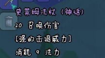 《泰拉瑞亚》手机版中的史莱姆法杖看名字你是不是觉得会是件很普通的装备?呵呵,你错了!史莱姆虽然普通,但是史莱姆法杖却是整个游戏中爆率最低的装备!严重怀疑是恶搞,不过讲道理这个法杖输出还是不错的,要是初期就掉了,那简直就是超跑起步了。史莱姆法杖 ID:1309 获得方式: 杀死 史莱姆 Slime和 史莱姆僵尸 Slimed Zombie。有0.01%的几率爆出。(此处的”史莱姆“包括整个史莱姆一家:蓝绿红紫黄黑、母体、飞翔、彩虹等等等等,但史莱姆王除外。)没错就是万分之一,整个游戏掉率最低的物品 攻击力:8点Buff:小史莱姆那叼着的是奶嘴么~~ 飞行状态: 攻击方式为以很快的速度撞敌人,击退效果很挫,但伤害还可以。要是开荒爆了史莱姆杖那么初期生存的难度就会大大降低。