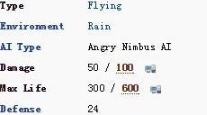 《泰拉瑞亚》手机版中的各色怪物是游戏的一大亮点,我们很多制造做需要的材料都来源于各色各样的小怪,今天给大家介绍的这只叫做愤怒雨云怪的生物还是挺有意的,一只悬浮在空中所以击杀起来还是有难度的哦。 愤怒雨云怪 ID:250类型:敌人AI类型:愤怒雨云AI环境:雨天伤害:50/100生命值上限:300/600防御:24击退抗性:70/73%免疫迷惑、中毒、剧毒愤怒雨云怪是肉山后雨天中出现在森林地区的敌人。它会一直锁定玩家,用在头顶下雨的方式攻击玩家,因为它一直漂浮在上方,所以击杀它会比较困难。掉落 击杀它们掉落3银币、雷云法杖。