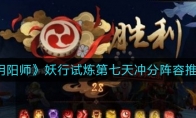 阴阳师妖行试炼第七天冲分阵容怎么组?《阴阳师》游戏中妖行试炼活动已经到第七天了,那么今天的阵容要怎样组合呢?今天小编就给大家介绍一下阴阳师妖行试炼第七天冲分阵容推荐,有需要的小伙伴不要错过了。相关推荐:《阴阳师》妖行试炼2021打法攻略 《阴阳师》妖行试炼第七天冲分阵容推荐一、御魂配速 山兔x4+大天狗呱+神乐山兔一号机卡在黑镜和铁鼠之间,235-230速招财地震鲶;山兔二号机>161速招财地震鲶,能被第一只兔子拉起来;三速超星大天狗呱,针女歌伎攻击越高越好;四速神乐;神乐技能可以带疾风和炼狱,炼狱用来补伤害。今天云外镜技能破魔(无法获得增益印记和状态),放了伞并不会显示受到伤害降低。五速六速山兔三四号机,生生生,速度低于128,全部招财地震鲶,生命尽量高。 二、打法流程 进去以后先吃三只铁鼠的一个大+两