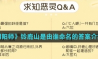 《阴阳师》游戏中铃鹿山是由谁命名的?这是一道非常有趣的问题,可以看得出来官方对于游戏中四周年庆用心了,很多玩家表示不知道这道题目的正确答案,那么接下来小编为大家带来《阴阳师》铃鹿山是由谁命名的答案介绍,一起来看看吧。小编推荐:《阴阳师》4周年求知恶灵答案汇总 《阴阳师》铃鹿山是由谁命名的答案介绍一、铃鹿山是由谁命名的 答案:铃鹿御前 二、其他海国问题答案 详情请见下图(点击可查看大图) 三、活动介绍 众心寻岳,麓海归途!超大型全服合战活动【麓海归途】开启为寻找大岳丸的踪迹,海国一行人重返铃鹿山,一切迎来新的开始活动时间:9.23~9.30活动期间阴阳师大人置身铃鹿山之中,在'虚之屿'与'实之岛'体验多种玩法。以上就是小编整理的关于《阴阳师》铃鹿山是由谁命名的答案介绍的全部内容,更多游戏攻略请持续关注3DM手游