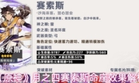 原神赛索斯命座效果怎么样,赛索斯具备特殊的二段蓄力效果,并可通过消耗能量来缩短蓄力时间,且天赋会基于自身精通数值转模蓄力箭的伤害倍率,大招期间可连续发射带有穿透性的箭矢,对路径上的敌人造成贯穿伤害。不同命数带来的效果加成也不同。《原神》月之四赛索斯命座效果解析:1命:封龛谒灵歌贯影箭的暴击率提升15%,增强二段速射蓄力的出伤;2命:寂秘纸草经通过触发蓄力耗能、E回能、Q这3种方式,分别叠加15%雷元素伤害加成,每层持续10s至多叠加2层,速切速射或是站场均可快速叠满;4命:真念鸵羽集当贯影箭或瞑弦矢命中≥2名敌人时,为全队提升80点元素精通,持续10秒;6命:巡日塔门书贯影箭在命中敌后,每15秒返还所消耗的能量,使得每轮循环中可以多打1次贯影箭,提升速切、驻场输出;以上就是3DM小编整理带来的原神赛索斯命座效果