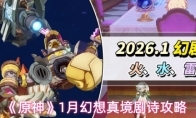 原神1月幻想真境剧怎么过,此次2026首期「1月幻想真境剧诗」更新!本期元素限制为火、水、雷,存在3个特殊BOSS,需对角色安排有一定规划。接下来冻梨会详聊角色排布与BOSS弱点分析,助你拿下本期幻剧奖励。《原神》1月幻想真境剧诗攻略:一、角色选取建议 「邀请助演」首选伊涅芙、菲林斯,同时自身携带爱诺,争取在第8幕之前拿到月感电队伍,可稳过此关。「特邀角色」其中温迪高频染火与柯莱燃烧都是圣牌挑战2的克敌好手,快速达成BOSS的火伤次数盾;希诺宁减抗治疗必选,闲云哪怕不玩下落体系凭群奶也值得选了。「火」杜林、玛薇卡(试用)、阿蕾奇诺、夏沃蕾、烟绯(试用)、班尼特、香菱、可莉。「水」爱诺、塔利雅(试用)、希格雯(试用)、芙宁娜、那维莱特、夜兰、珊瑚宫心海、行秋。「雷」菲林斯、伊涅芙、瓦雷莎、伊安珊(试用)、欧洛伦、