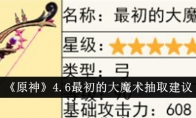原神4.6最初的大魔术抽什么好?原神4.6版本很多人看到出了这个最初的大魔术了,那么要是想抽的话就需要知道下最初的大魔术的强度了,然后在去选择一些去培养了,那么大家不会的来看看吧!《原神》4.6最初的大魔术抽取建议专门重击的弓,瞄准射击类的角色都可以使用,并且队伍中的同元素可提升攻击力,不同元素可提升移速,根据情况,可以组2、3同元素的方式吃满攻击力加成,移速方面倒不怎么推荐组3个不同元素的吃满移速加成,因为对伤害没帮助,但多多少少是可以提升操作手感的。要是能入手最好,等到后期别的新重击弓角色都能用的,所以看来性价比上也是比较的高了。以上就是3DM小编整理带来的原神4.6最初的大魔术抽取建议,更多相关游戏攻略,请关注3DM手游网!