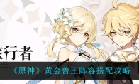 原神在2.3版本上线了全新boss黄金兽王。很多小伙伴都很想知道打黄金兽王应该用什么阵容,今天小编给大家带来了《原神》黄金兽王阵容搭配攻略。感兴趣的小伙伴一起来看看吧,希望可以帮助到大家。《原神》黄金兽王阵容搭配攻略由于黄金王兽没有类似魔偶剑鬼、若陀龙王那样的强制锁血机制,因此大致的攻克思路可以分为两种:高伤爆发队伍以及常规破盾队伍。注:下文中,E为元素战技,A为普通攻击。1、高伤爆发队伍虽然黄金王兽会开盾,但使用爆发阵容的我们只需要找准时机上好buff,通过主C的高额伤害一波将其秒杀带走即可。这类型的配队大致由3辅助+1主C构成,配队比较自由,常用的辅助角色有莫娜、枫原万叶、班尼特、九条裟罗等,常用的主C有甘雨、优菈、雷电将军、达达利亚等。注:角色推荐不限于此,只要能达成高伤爆发来跳过破盾秒杀BOSS的目标,