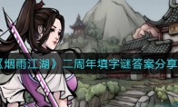 《烟雨江湖》游戏中二周年填字谜活动已经上线,玩家们完成之后就可以获取奖励,那么今天小编就给大家介绍一下烟雨江湖二周年填字谜答案分享,有需要的小伙伴不要错过了。《烟雨江湖》二周年填字谜答案分享腹有诗书气自华整个庙会活动期间,各侠士都可以找落榜书生挑战填字谜。字谜中会有一些常见的成语俗语,亦或是独属于烟雨江湖的专有词汇。同时,抽奖活动也在进行,剪纸与窗花相配,每一张薄薄的剪纸后面,都有可能藏着一个惊喜!若是运气甚佳,还可能得到意外之喜~以上就是《烟雨江湖》二周年填字谜答案分享,更多游戏攻略请持续关注3DM手游网!