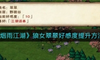烟雨江湖狼女翠翠好感度怎么提升?《烟雨江湖》游戏中狼女翠翠好感度的提升方法有很多玩家不清楚,那么今天小编就给大家介绍一下烟雨江湖狼女翠翠好感度提升方法,感兴趣的小伙伴不要错过了。 《烟雨江湖》狼女翠翠好感度提升方法「异闻录·其一」、「异闻录·其二」、「异闻录·其三」、「异闻录·其四」提升5点好感度「异闻录·其一」:洛阳-文成书肆(16,29)购买,10两/本,每日限购1本「异闻录·其二」:幽州-如玉书店(16,29)购买,10两/本,每日限购1本「异闻录·其三」:成都-书坊(12,5)购买,10两/本,每日限购1本「异闻录·其四」:南阳渡-画摊(25,17)购买,10两/本,每日限购1本 「奇女子传」、「奇女子传」、「洞天福地记」提升7点好感度「奇女子传」: 凤鸣集-凤鸣书院(32,2):凤雏老人,打听【江湖话