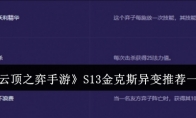 云顶之弈手游S13金克斯异变适合什么?最近关于云顶之弈s13金克斯异变适合什么的讨论越来越多,那么今天小编机会为大家准备了这篇攻略教程,助你快速解决问题!《云顶之弈手游》S13金克斯异变推荐一览主选:纳沃利精华次选:连杀备选:绝不浪费推荐分析:1、金克斯异常突变最适合纳沃利精华,金克斯放技能很快减蓝条之后无限放技能。2、金克斯主选法力值类异常突变,没有纳沃利精华的话选择来连杀和绝不浪费都可以3、金克斯装备羊刀、无尽、正义拳,金克斯适合纯输出装,配合蓝发小队羁绊无限放技能。4、绝不浪费在没有经济刷新的情况下也可以选择,缺点是前排队友死的慢启动也慢,没有纳沃利精华直接。以上就是3DM小编整理带来的云顶之弈手游S13金克斯异变推荐一览,更多相关游戏攻略,请关注3DM手游网!