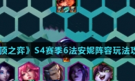 《云顶之弈》S4赛季6法安妮阵容怎么玩?游戏中即将迎来全新的S4赛季,在新赛季中会加入全新的英雄和羁绊,随着新英雄和羁绊的加入,游戏中也会有全新的阵容搭配,那么接下来小编为大家带来《云顶之弈》S4赛季6法安妮阵容玩法攻略,一起来看看吧。 《云顶之弈》S4赛季6法安妮阵容玩法攻略阵容英雄 安妮,慎,莉莉娅,娜美,狐狸,莫甘娜,璐璐,蛇女核心英雄装备 安妮:石像鬼,科技枪狐狸:帽子,青龙刀莫甘娜:鬼书,蓝帽子慎:日炎阵容站位 阵容运营 开局上4人口,首先大家要理解法师这个羁绊什么意思,全体法师双重施法,并且法强会被调整,第一层羁绊是65%,也就是说,两次施法,总计造成130%的伤害,提升了30%,这个羁绊前期就比较鸡肋了,增加的伤害非常少。所以,前期建议使用万物通用的日炎过度,后期也可以转给安妮和肾。前期重装、斗