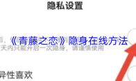 打开青藤之恋APP,点击右下角“我的”进入个人中心,在页面中找到并点击“设置”选项,进入设置界面后选择“隐私设置”,找到“在线状态”选项并将其关闭,即可隐藏自己的在线状态,避免他人看到你是否在线。青藤之恋怎么隐藏在线状态?1、进入青藤之恋页面,点击【我的】。2、来到我的主页,点击【设置】。3、进入设置,点击【隐私设置】。4、来到隐私设置,然后把【隐身】的按钮开启。5、弹出下面的界面,然后选择隐身原因,再点击【开启】即可。以上就是小编带来的青藤之恋怎么隐藏在线状态?隐身在线方法,更多相关资讯教程,请关注3DM手游网。