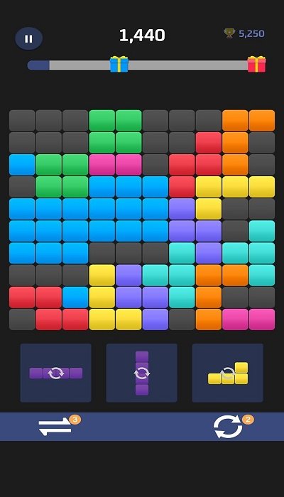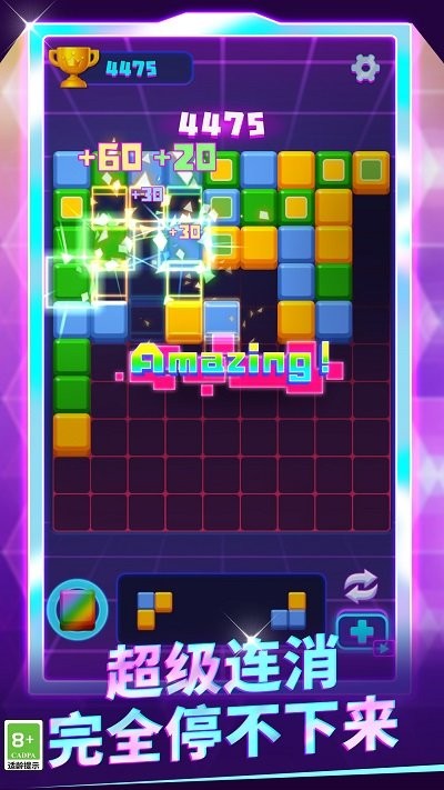 1010方块爱消除游戏是一款集方块拼接与消除挑战于一体的休闲益智游戏。玩家需要合理摆放不同形状的方块,填满行或列以消除方块,获得高分并完成关卡目标。在1010方块爱消除游戏里面,游戏操作简单易懂,但随着关卡的推进,布局策略和空间利用将成为通关关键。丰富的关卡设计和逐渐增加的难度,让玩家在轻松愉快的氛围中锻炼逻辑思维和空间想象力。鲜明的画面风格和流畅的操作体验,使游戏适合所有年龄段的玩家。