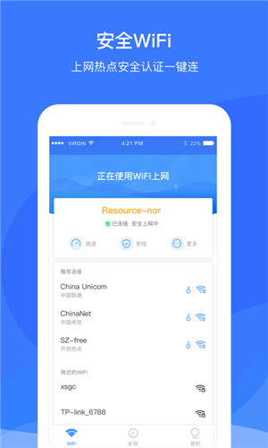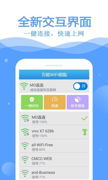 WiFi速联钥匙是一款优秀的免费WiFi优化神器,拥有丰富的WiFi优化功能和选项,随时帮助用户在线优化网络,轻松帮助用户解决手机上网慢的问题,给用户带来全面的服务和体验,还支持一键安全连接WiFi网络,自由享受极速上网,能完全满足用户的使用需求,还内置智能网络测速,优化等,轻松体验便利的上网浏览,而且该软件内置简洁的界面设计,可以轻松体验高效WiFi网络连接和管理,随时随地体验免费WiFi上网过程,有兴趣的用户欢迎下载。