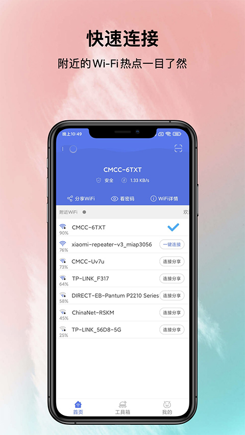 WiFi密码显示器 手机安卓版是一款免费的手机WIFI密码显示软件。当手机连接wifi时,您可以在没有root的情况下查看wifi密码,并一键显示wifi密码。无需担心如何用手机更改wifi密码。使用手机查看、显示和修改wifi密码时,您可以使用wifi密码查看器,您周围的wifi连接到管家。此应用程序主要用于查看当前设备已连接的所有WIFI名称和密码,而不是破解WIFI密码。可用于找回忘记的WIFI密码;在多网络环境中工作时,您还可以区分每个同名的WIFI密码,这便于您的办公笔记本电脑连接。你见过吗:当你更换新的安卓手机时,你需要上网冲浪,却发现你忘记了密码,因为你已经很久没有输入WIFI密码了。