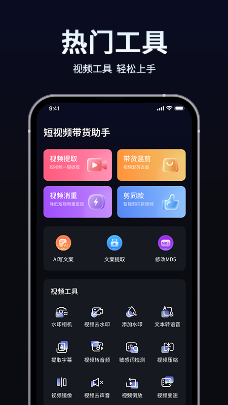 短视频带货起号助手app下载安装是一款专为电商创作者精心打造的综合性创作软件,它深度聚焦电商短视频创作场景,为创作者提供一站式解决方案。平台功能丰富多元,主要涵盖了视频提取、视频消重、添加水印、视频变速等多种专业且实用的视频创作工具。这些工具操作简便,用户可根据自身创作需求随心运用,能够高效创作出专属的、独具特色的短视频作品,让创作者足不出户就能享受专业级的视频创作体验,助力其视频创作水平稳步提升。