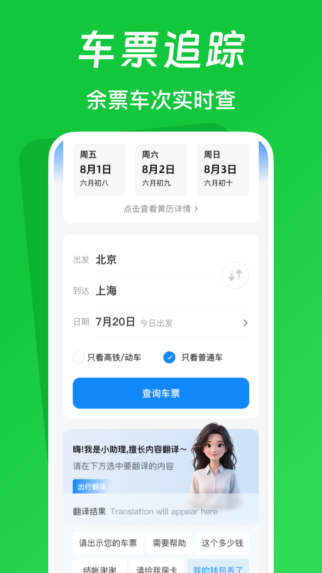 铁行火车票是一款可以轻松购买火车票的出行软件,在软件中拥有简单易上手的功能可以免费使用,让用户轻松自由购买各种火车票和高铁票,可以允许用户自由查询出行日期并轻松预约抢票,给用户带来全面的服务和体验,同时还允许用户查询最新的出行日期并显示多个时间段的火车票,能完全满足用户的使用需求,还内置安全的账号保护和支付系统,可以让用户轻松购买火车票,随时联系24小时客服,轻松帮助用户解决购票问题。