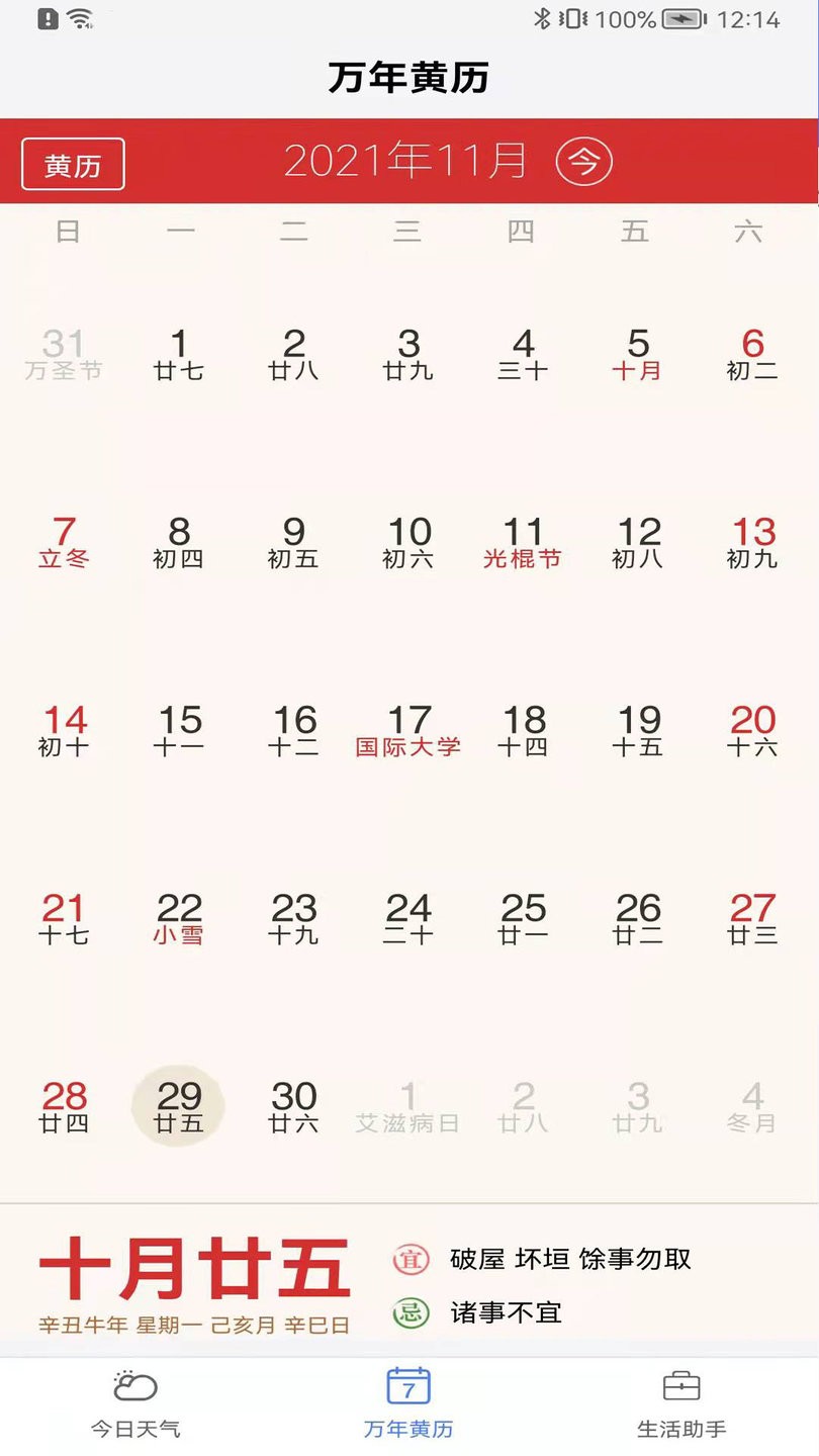 吉祥天气老黄历万年历APP是一款功能丰富实用的天气日历软件。用户还可以一键查看相关实时天气信息,轻松掌握天气预报,了解未来天气趋势,方便出行准备。它还为用户提供城市空气质量监测。用户可以查看城市空气质量数据,方便查看,实时关注自身健康。该软件具有广泛的功能,支持会议提醒、笔记、待办事项清单和其他事项。一旦用户提前设置好,他们就不再需要担心忘记重要的事情。还支持年历、节日、节气的吉凶查询,让您的日常生活更加方便。