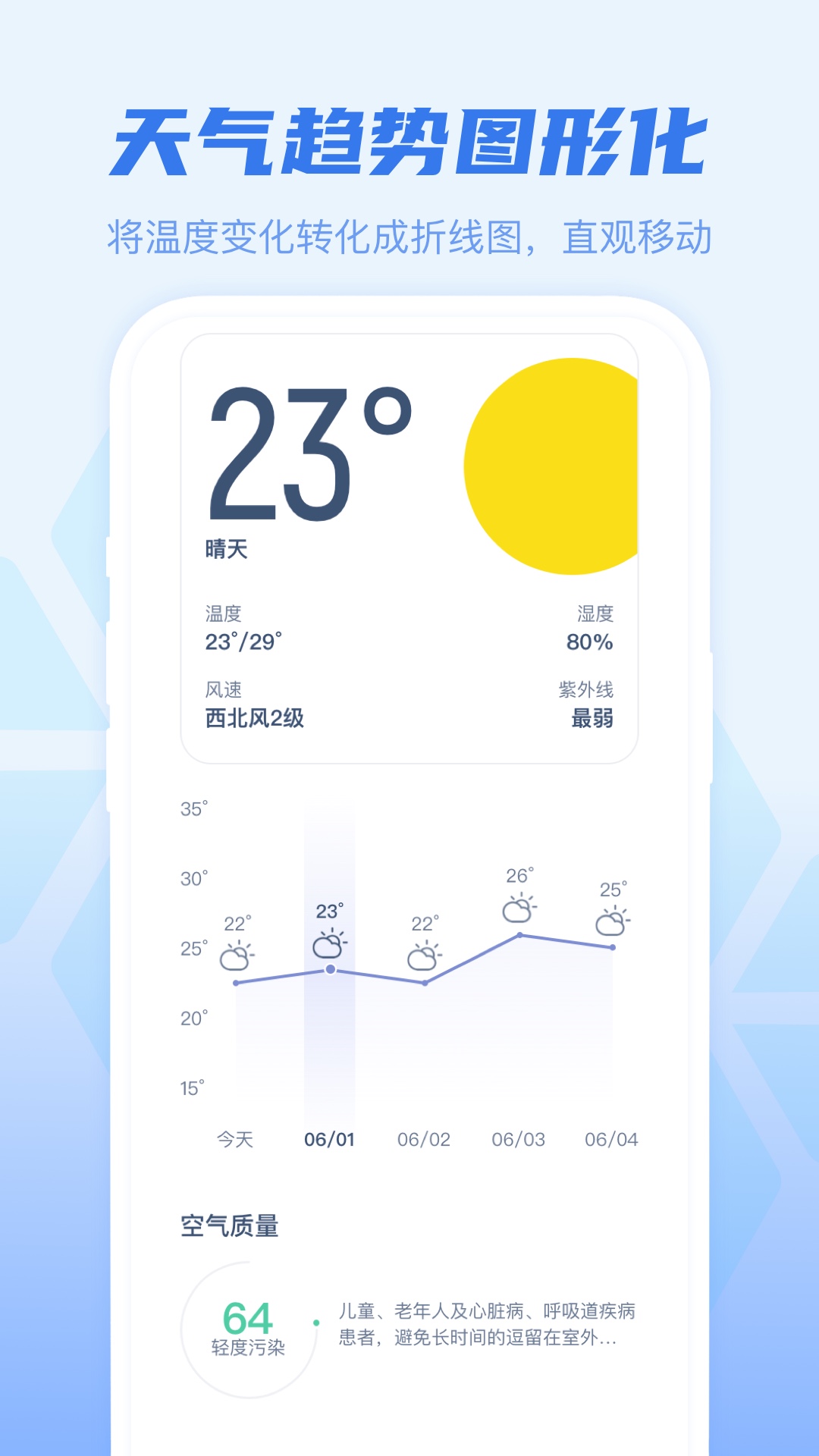 随时看天气APP是一款功能强大好用的精准天气预报工具。采用权威数据源授权的天气信息,支持国内外3000多个城市、700多个景区的天气预报和实时天气预警信息全覆盖。它可以即时推送分钟级天气预报,还可以查询城市的小时预报和空气质量指数,分析空气质量和趋势。还有一个温馨智能的提醒服务,比如下雨时提醒带伞,天冷时提醒多穿衣服。它非常方便,用户友好。软件中的字体和图片都很大,对于老年人来说非常方便。