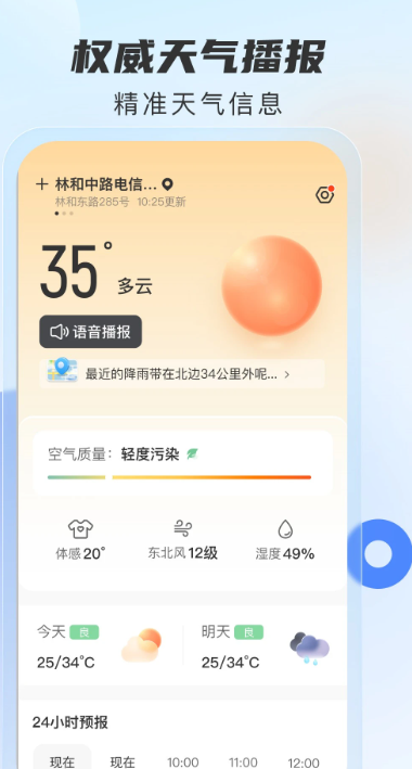 明日天气查询是非常方便实用的天气预报APP,不仅具有简单的大气界面设计,还具有超强的语音播报功能,支持24小时的准确预报,给用户的生活带来了极大的方便。这里任何天气信息的内容都可以马上得到。用手机看天气的方法很简单,随时都能轻松掌握。 另外,还可以了解最新的天气动态。方便你体验最好的旅行便利,感兴趣的朋友不要错过下载明日天气查询软件。