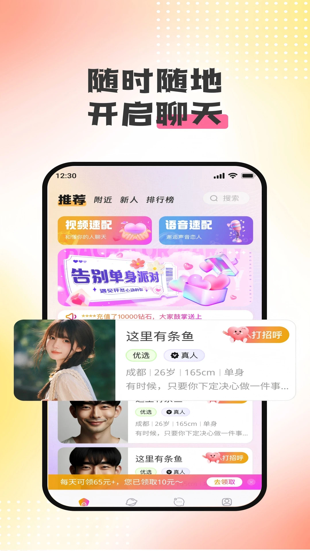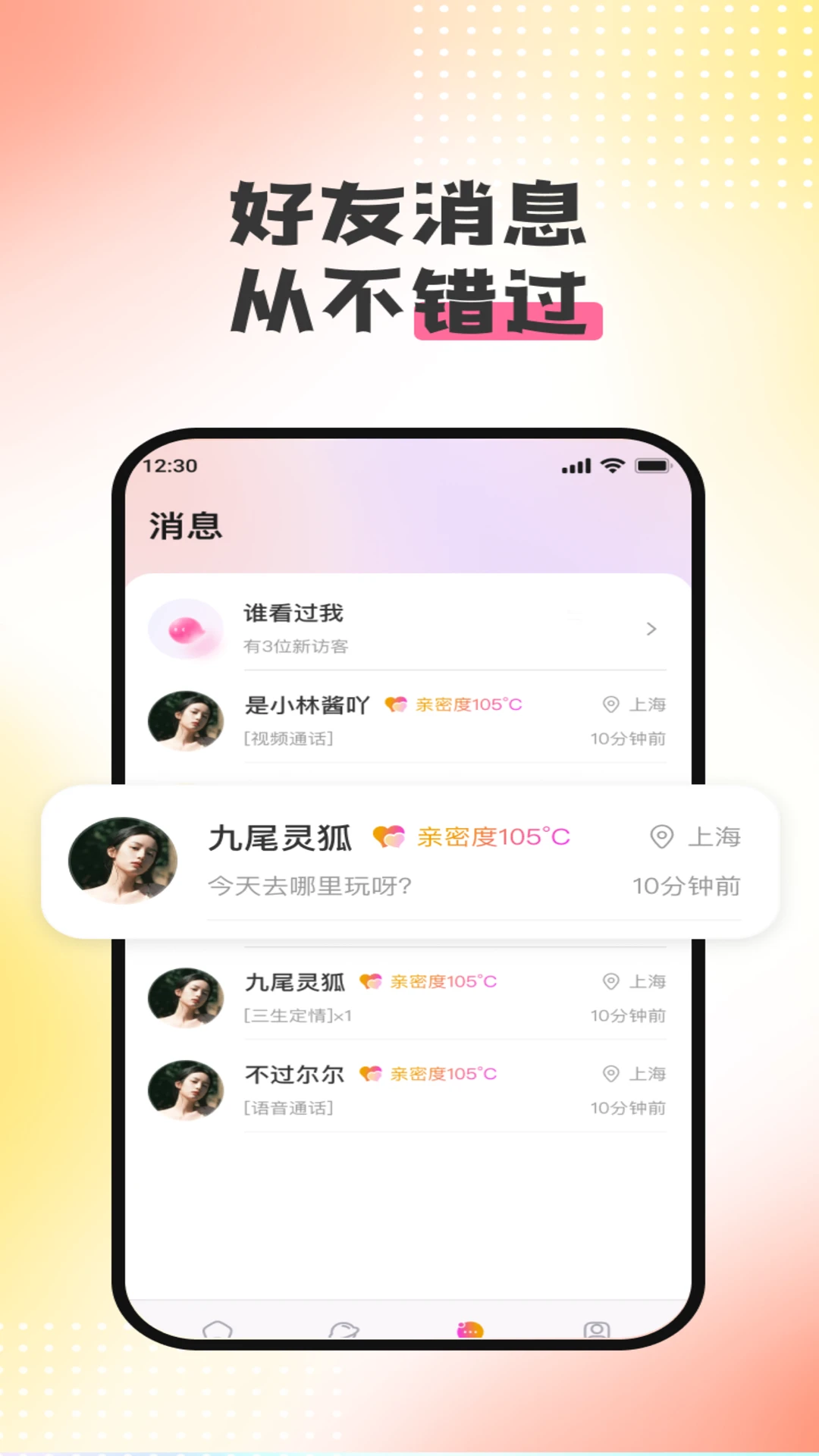 在这里可以体验很多有趣的社交。可以享受简单真实的缘分速配,通过匹配可以轻松认识很多陌生人。大家可以在线畅所欲言,享受新的热恋邂逅。从今以后,大家在这缘分上社交相遇会更安全。另外,在软件内,交友约会是绝对真实的,注册账号是绝对的实名认证,感兴趣的朋友不要错过下载。