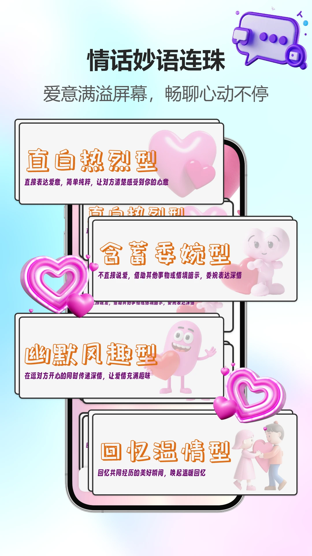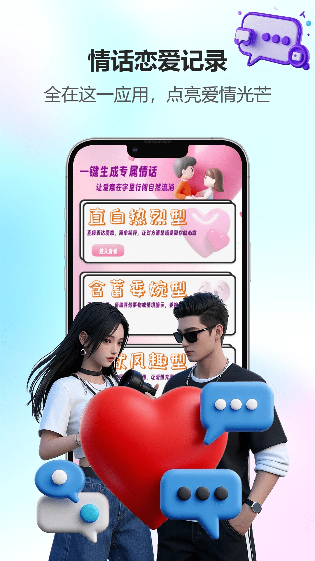 泡泡聊天可以一键生成专属爱情故事,直白而温暖,含蓄而委婉,幽默而深情。也可以记录下恋爱的分分秒秒,写下你和你爱的人在一起的浪漫瞬间和地点,珍藏你的甜蜜回忆。有很多娱乐功能可以用,很多有趣的活动都可以参与其中。泡泡聊天营造独特的聊天环境,让用户可以方便地与喜欢的人互动,增进相互了解,提升社交体验。感兴趣的朋友不要错过下载泡泡聊天软件。