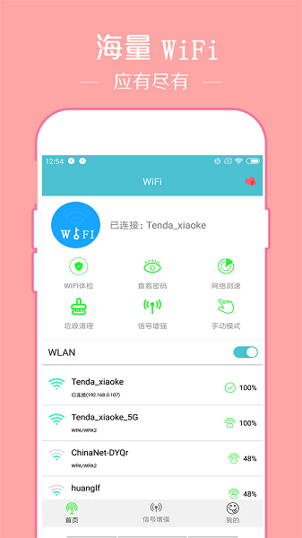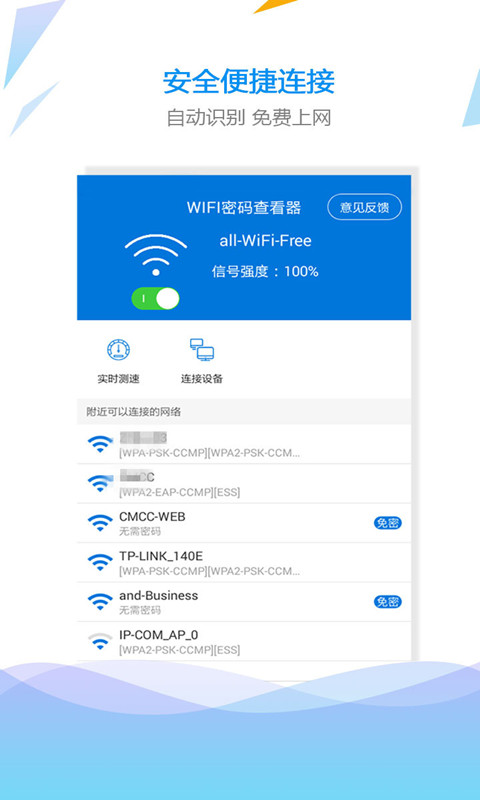 已连WiFi密码查看是一款能够连接WiFi密码的免费上网工具,密码查看、安全检测,信号增强,管理WiFi的APP工具。通过直接扫描二维码连接wifi无需输入wifi密码即可实现快速的接入无线网络。让你轻松实现上网。再也无需苦恼用手机怎么改wifi密码,手机查看、显示、修改wifi密码就用wifi密码查看器,你身边的wifi连接管家。支持部分型号“免Root查看密码”功能。