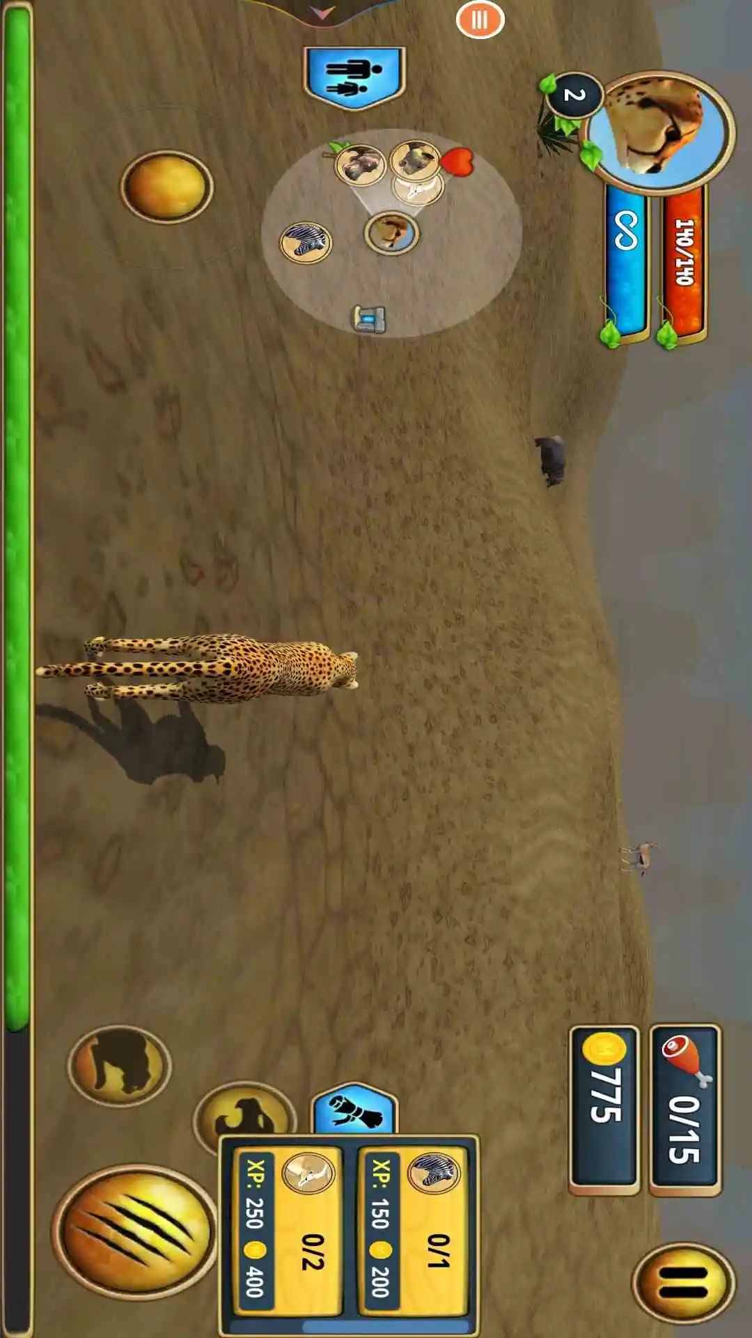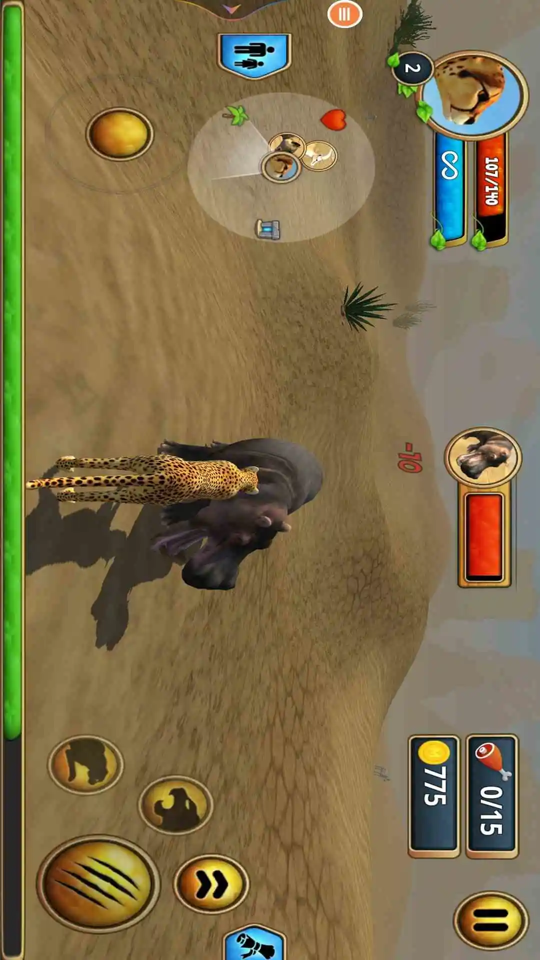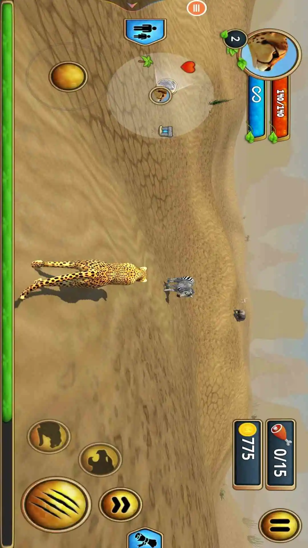 猎豹模拟器是一款优秀的动作模拟游戏。我们将来到炎热的非洲大草原,这里草原面积广阔,野生动物种类繁多,有大象、野猪、羚羊、狮子、犀牛等。玩家将扮演其中一只凶猛的猎豹,体验狩猎食物、激烈战斗和建立家庭的原始生活。游戏真实模拟了猎豹的生命值、饥饿值、口渴值等数值。玩家可以控制猎豹进行奔跑、跳跃、咆哮、攻击等动作。用你敏捷的动作和锋利的爪子打败各种动物,称霸动物世界!