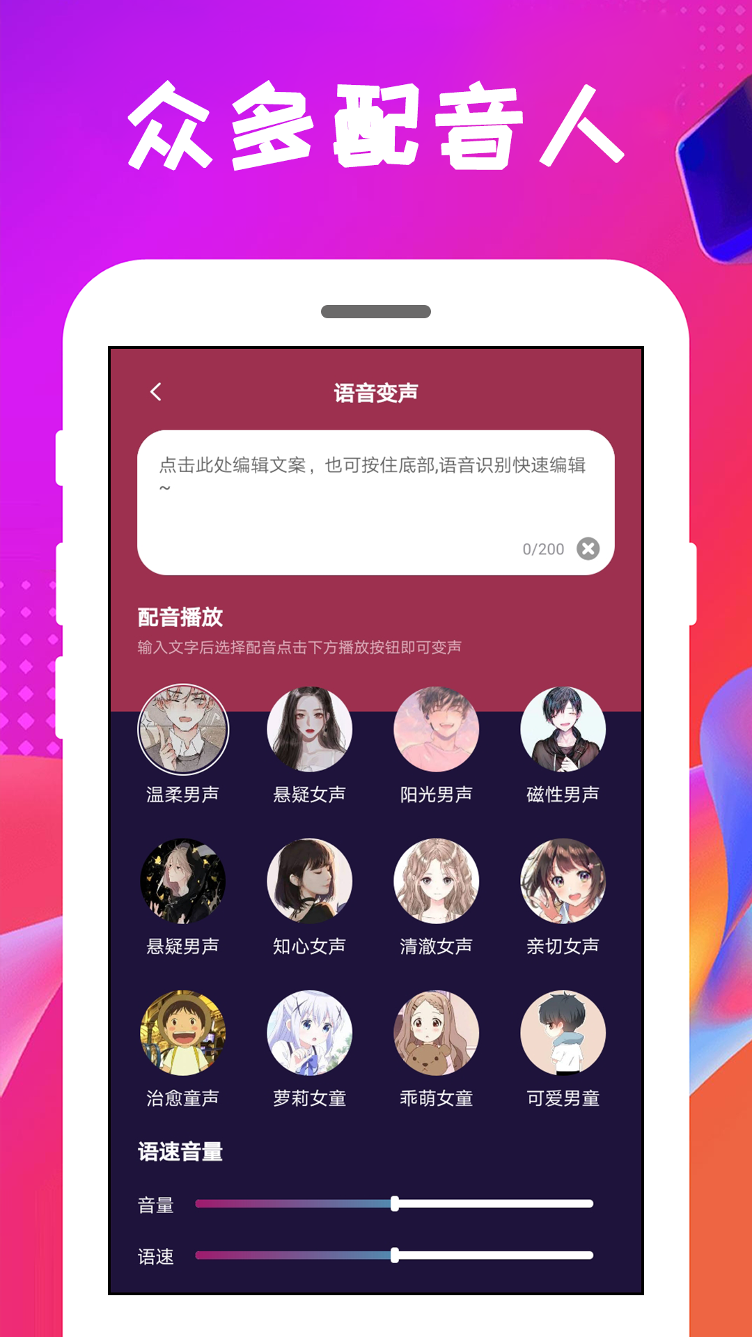 手机万能变声器是一款让人欲罢不能的变声语音工具,内含丰富真人语音包与百变特效,轻松满足聊天搞怪、社交娱乐、语音整蛊等多场景需求。不论是恶搞好友、模仿主播、扮萌配音,还是录制音频内容创作,只需一键即可切换声音,玩法简单又上头,带来无穷乐趣。全程无需剪辑基础,一键搞定录音加变声,萌新也能轻松上手。使用界面简洁清晰,分类明确,找语音不费劲,操作更流畅。