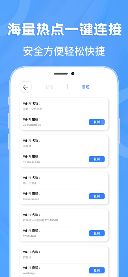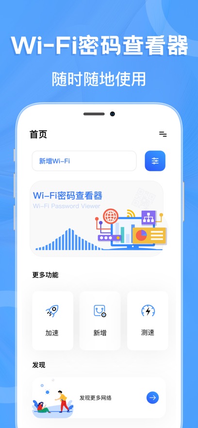 WiFi密码查看器软件是一款免费的手机wifi密码显示软件,主要用于显示当前设备连接结果的所有wifi名称和密码,而不是破解wifi密码。WIFI密码当您在多个网络环境中协同工作时,WiFi密码查看器软件还可以识别具有相同名称的每个WIFI密码,方便您通过无线链接连接到互联网。另外,WiFi密码显示神器软件集成WiFi速度、流量监控、WiFi信号增强、WiFi一键安全(显示链接的设备)等WiFi辅助工具,WiFi按键工具用于广泛的WiFi控制。