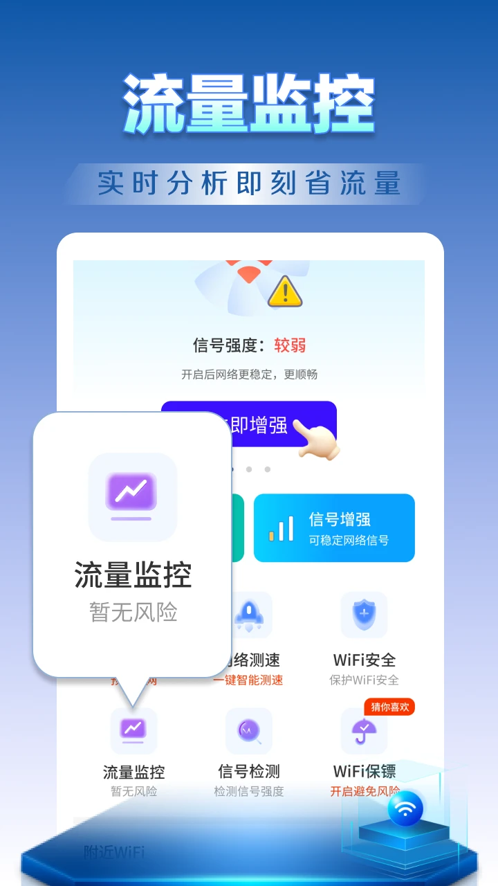 WiFi万能现连是一款质量非常高的WiFi连接工具软件,提供各种WiFi功能设置,可以为用户快速查找免费、安全的WiFi热点。用户可以快速连接到WiFi,进行各种各样的网络冲浪,享受安全、稳定、高速的网络环境,WiFi万能现连APP是优秀的WiFi连接助手。不仅如此,WiFi万能现连APP还实时为用户监控手机内各APP应用的流量使用情况,轻松掌握自己的流量消费明细,方便的流量使用管理,有效避免超额使用流量,导致不必要的费用支出 需要的用户马上在本站下载WiFi万能现连APP体验吧。
