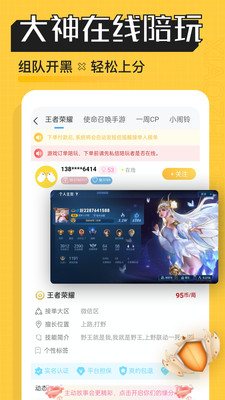 小鹿组队电竞陪玩最新版是一款在线电竞游戏训练软件。支持游戏伴奏、黑队、语音连接等功能。汇集了众多主流电竞爱好者,可以互相交流,讨论,玩游戏。而且只需一键,就能快速匹配到音效好、技术强、服务优的游戏高手,为你提供游戏伴侣。而这些各个游戏领域的高手和顶级射手,既有漂亮的皮囊,也有有趣的灵魂。我们可以和你语音连接,和你玩游戏,让你玩得开心和刺激!还有新的好玩的电竞模式等你去体验,多角色语音包等你去获取,新的游戏详细数据等你去尝试。众多热门游戏(如王者荣耀、和平精英、英雄联盟DOTA2、魔兽世界、炉石、DNF、守望先锋等),海量优质大神集合,时刻带着你自己的个性化定制!卢晓组队电竞官方版随时随地陪你玩,为你提供多重陪伴!