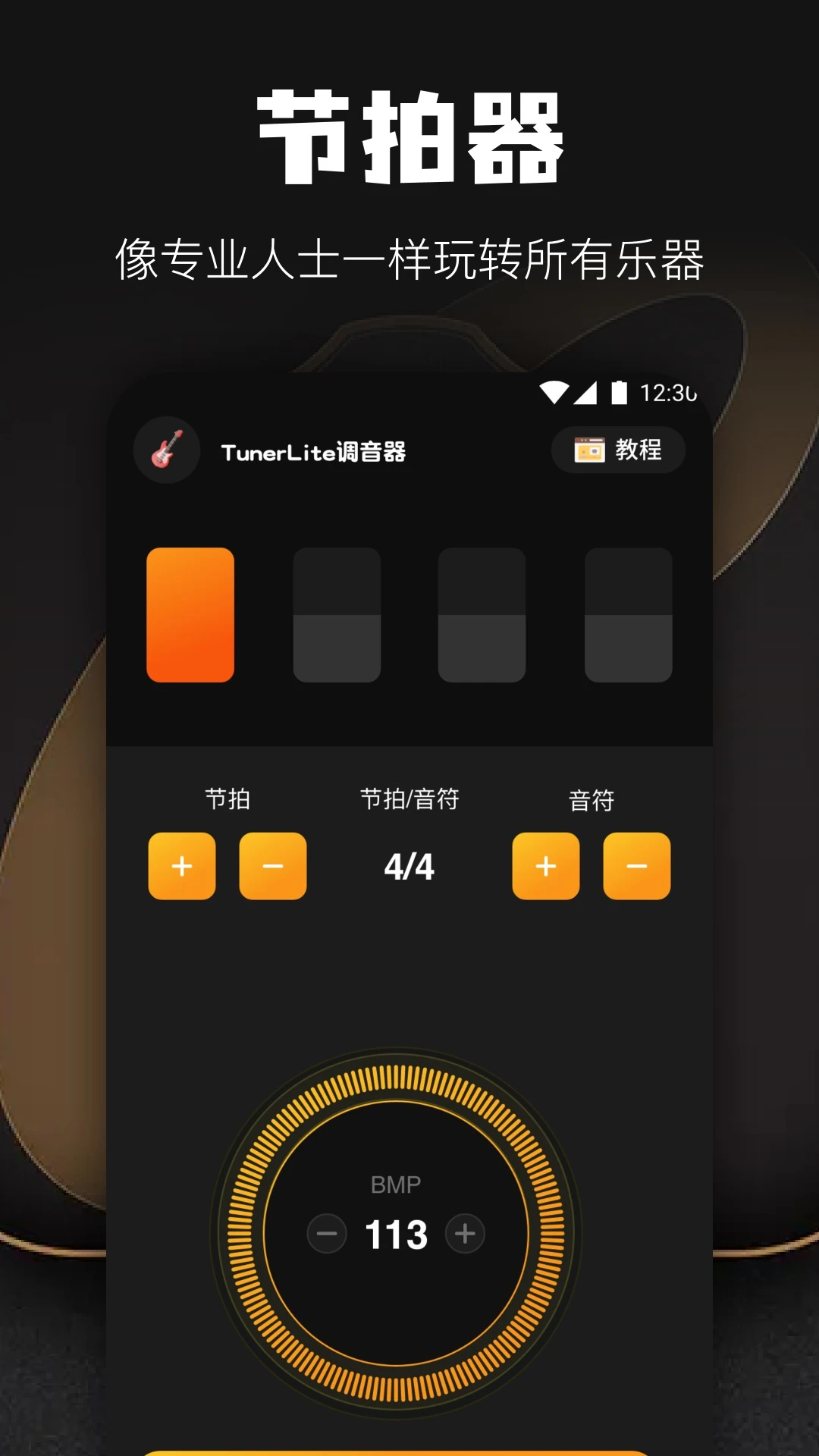 吉他调音器下载并安装是一款非常好用的辅助工具。让很多需要学习乐器的用户得到更多帮助的辅助工具,有着丰富的乐器和极度精准的乐器调节功能,让你更接近声源的进行弹奏操作,获得精美的乐器发声体验,快来下载尝试一下吧!