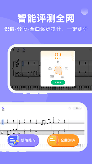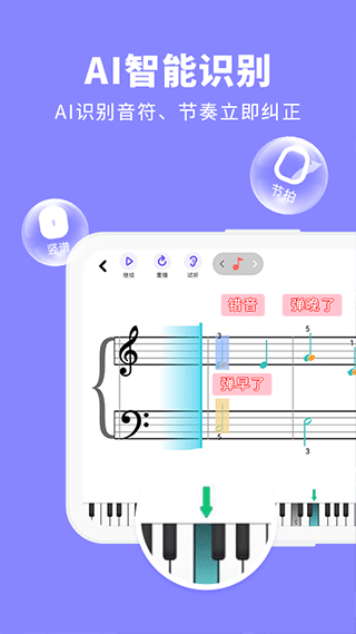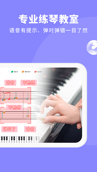 钢琴智能陪练是一款专为学习钢琴的朋友们所打造的应用软件,软件中包含了当前通用的各类教材和各式曲风的钢琴谱,曲谱包含由简单到高级的三种不同难度,哪怕是初学者也能快速上手演奏。同时,软件还将上线自主研发的课程,让零基础的同学也能快速的入门,而且用户可以带着孩子练琴,智能纠正错音、节奏等问题,每天24小时陪练,无需约课。软件中的AI智能功能会根据用户弹奏情况,再来制定合适的练琴计划,从而可科学有效的帮助用户提高技术。